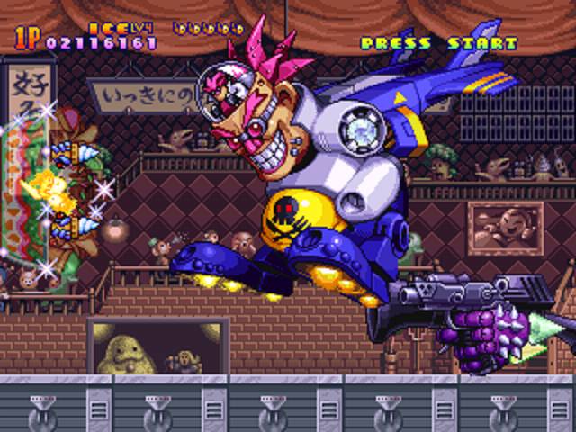 One of the nice things about Harmful Park is its simplicity. You can play for score, there is a score multiplier for chaining successful enemy hits, plus a hefty end of level bonus if you clear 100 per cent of enemies for that particular stage, and there are also green gems and hidden icons to pick up to increase score too. Alternatively, you can just play for fun and enjoy the amazing detail of the sprites and backgrounds while the cheerful background music plays. The only on-going strategy you need to employ is deciding which of the four weapons you wield and how you wish to power them up. After each stage a small animation plays detailing your progress through the “story”, but sadly this is all in Japanese, so I have no idea what they’re saying!